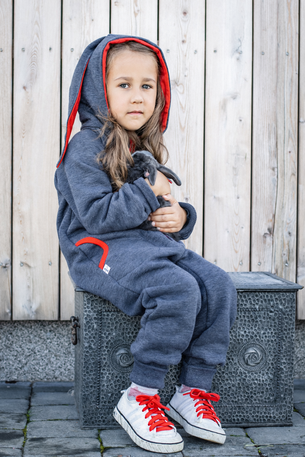 Jaukus, šiltas, nuotaikingas melsvas kombinezonas su raudonomis ausytėmis