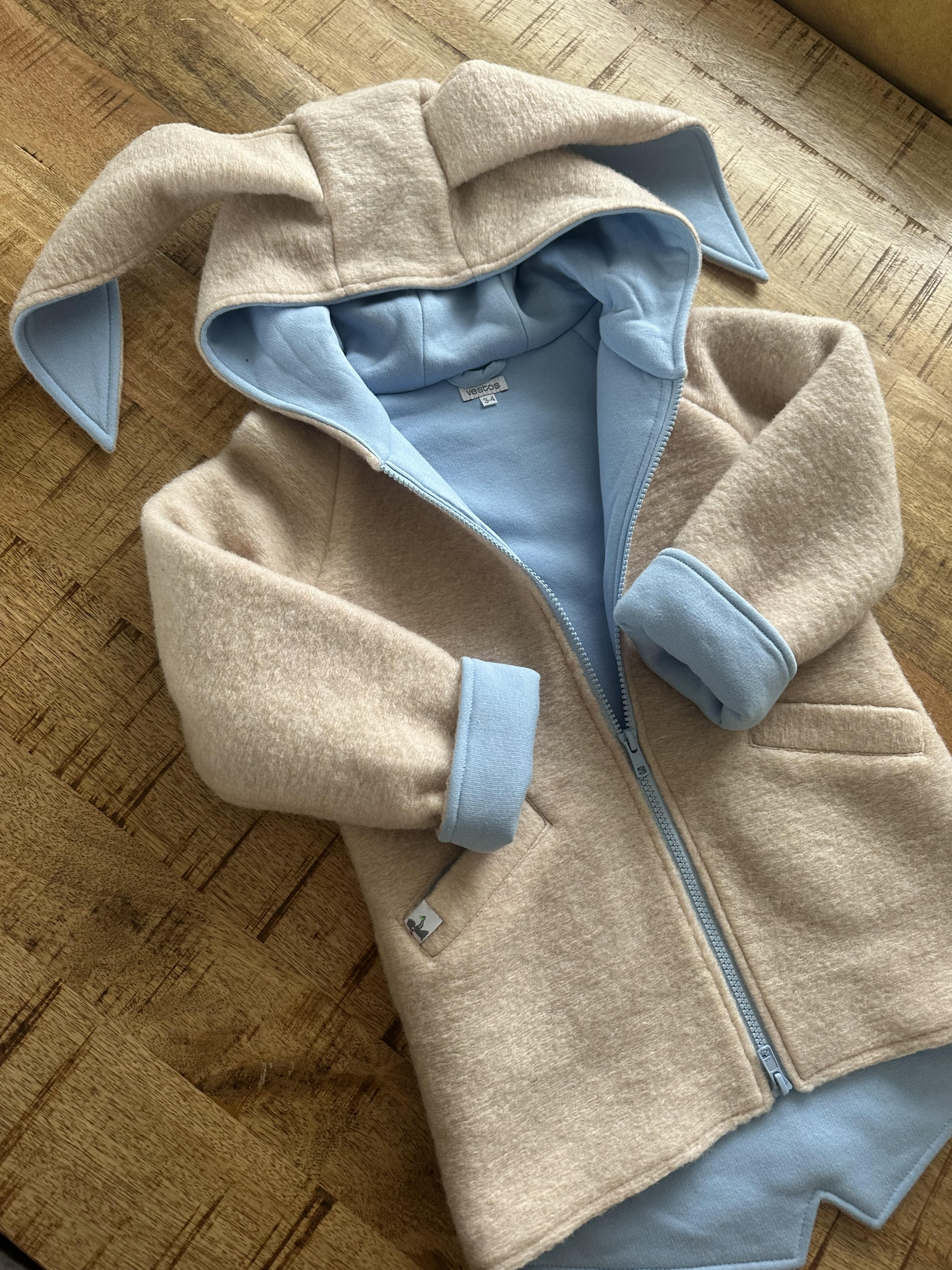• Kreminis vilnonis paltukas su žydru medvilnės pamušalu