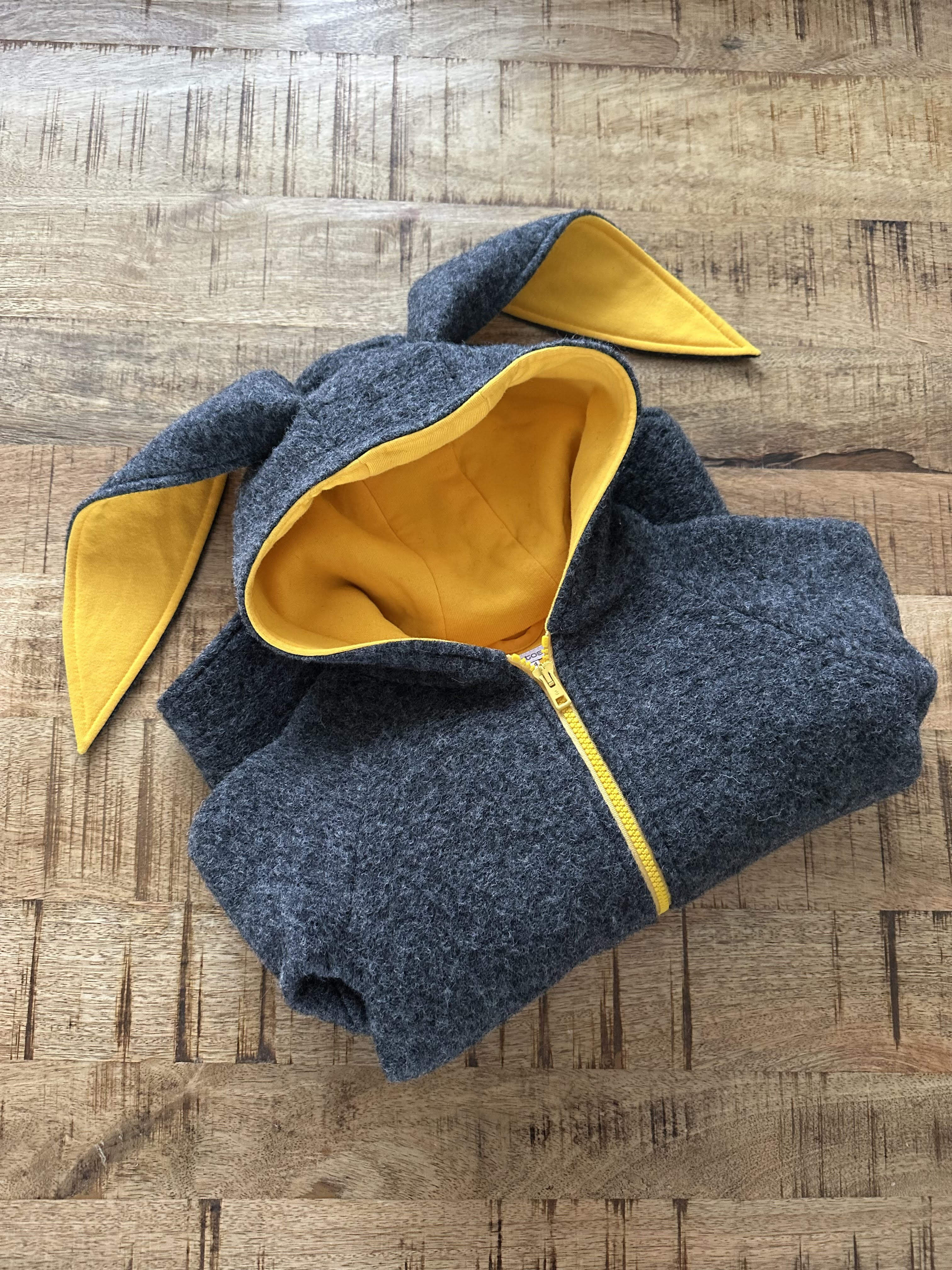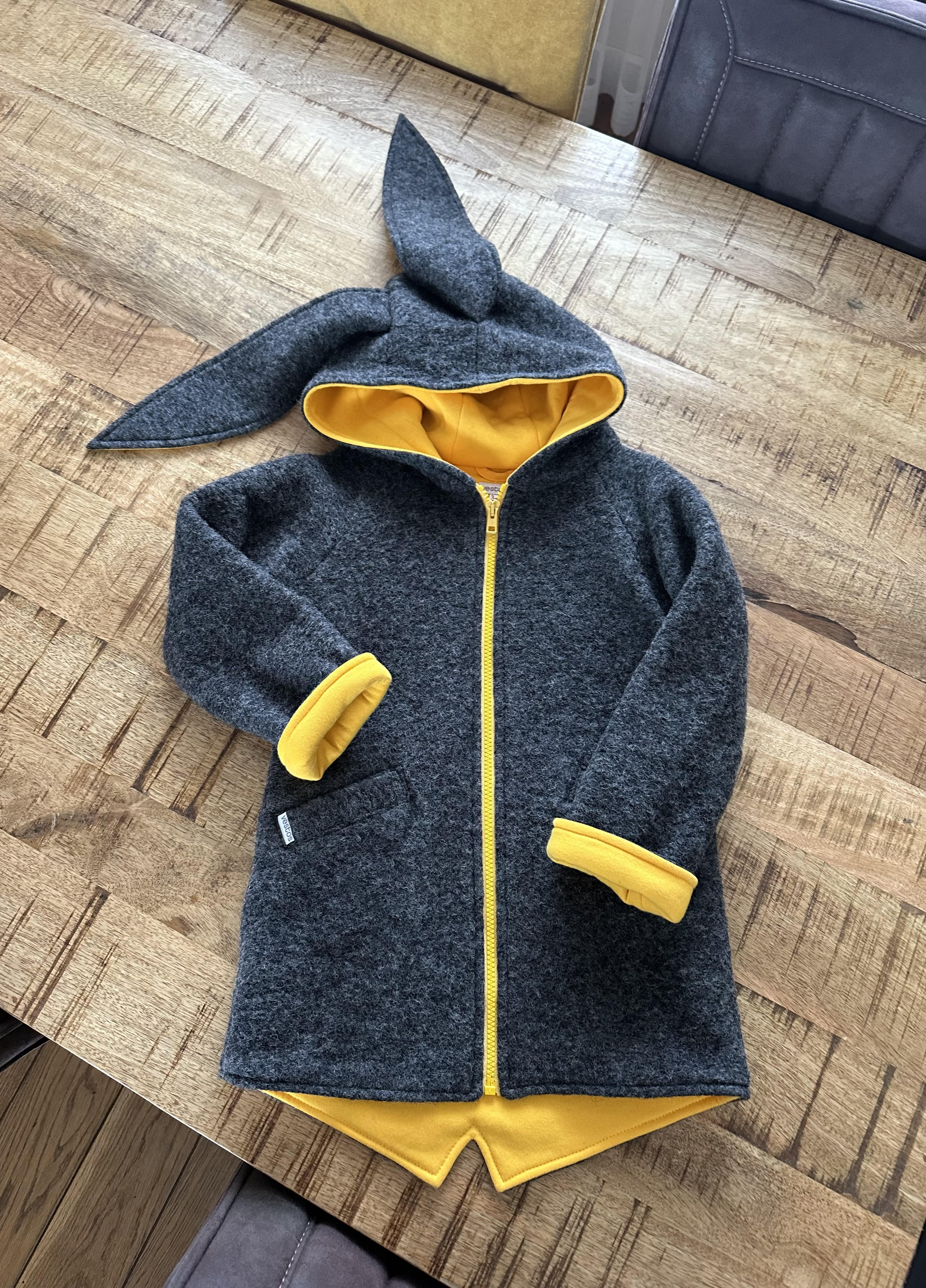- Pilkas vilnonis kiškio paltas geltonu pamušalu