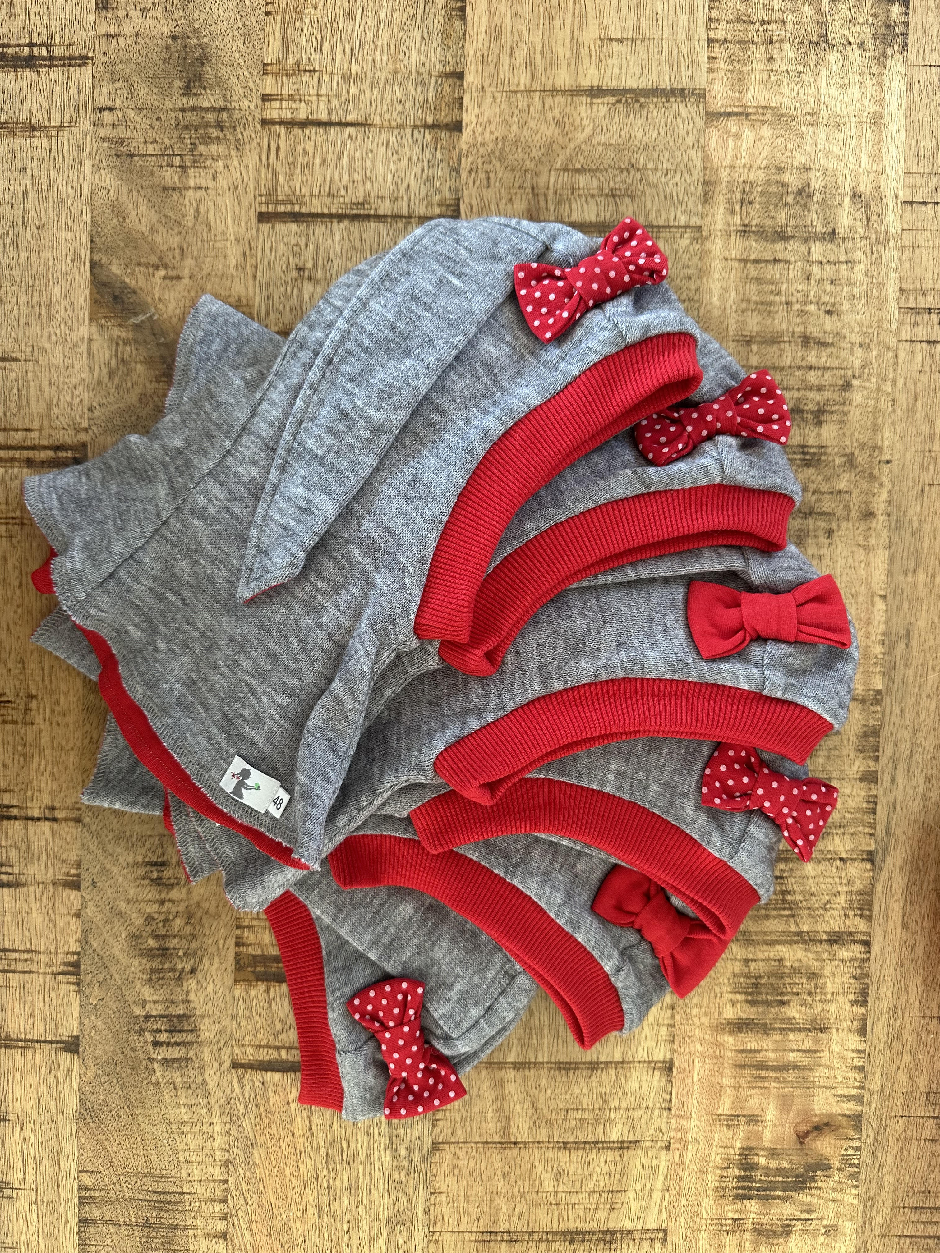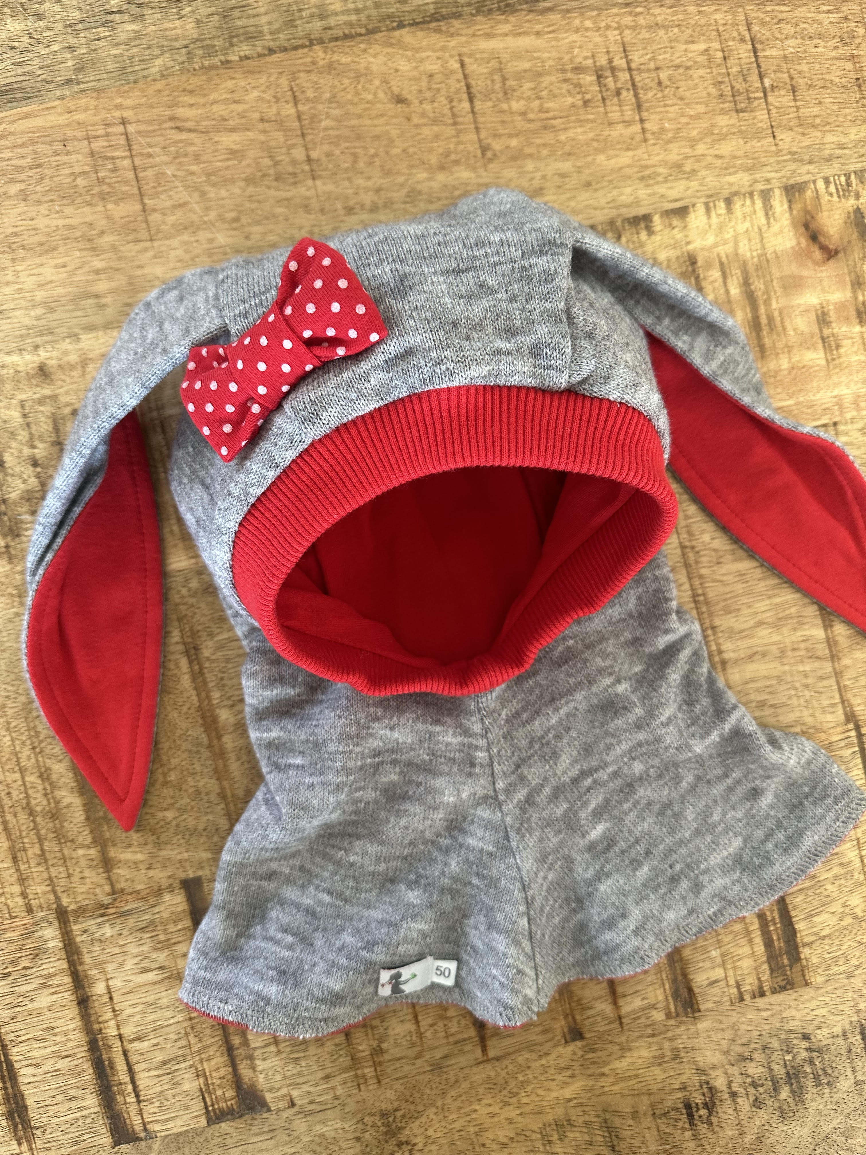 Su raudonom ausytėm, bantuku ir apvadėliu aplink veiduką.
