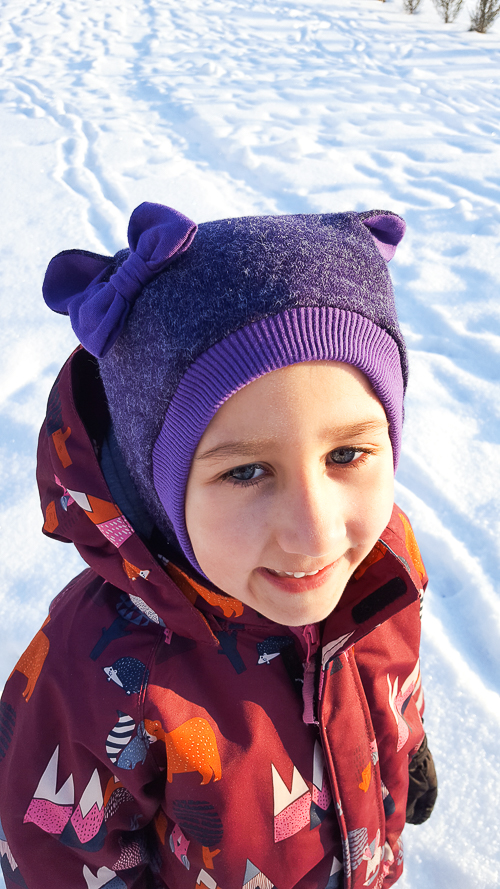Violetinis šalmiukas su mažom ausytėm ir kaspinėliu.