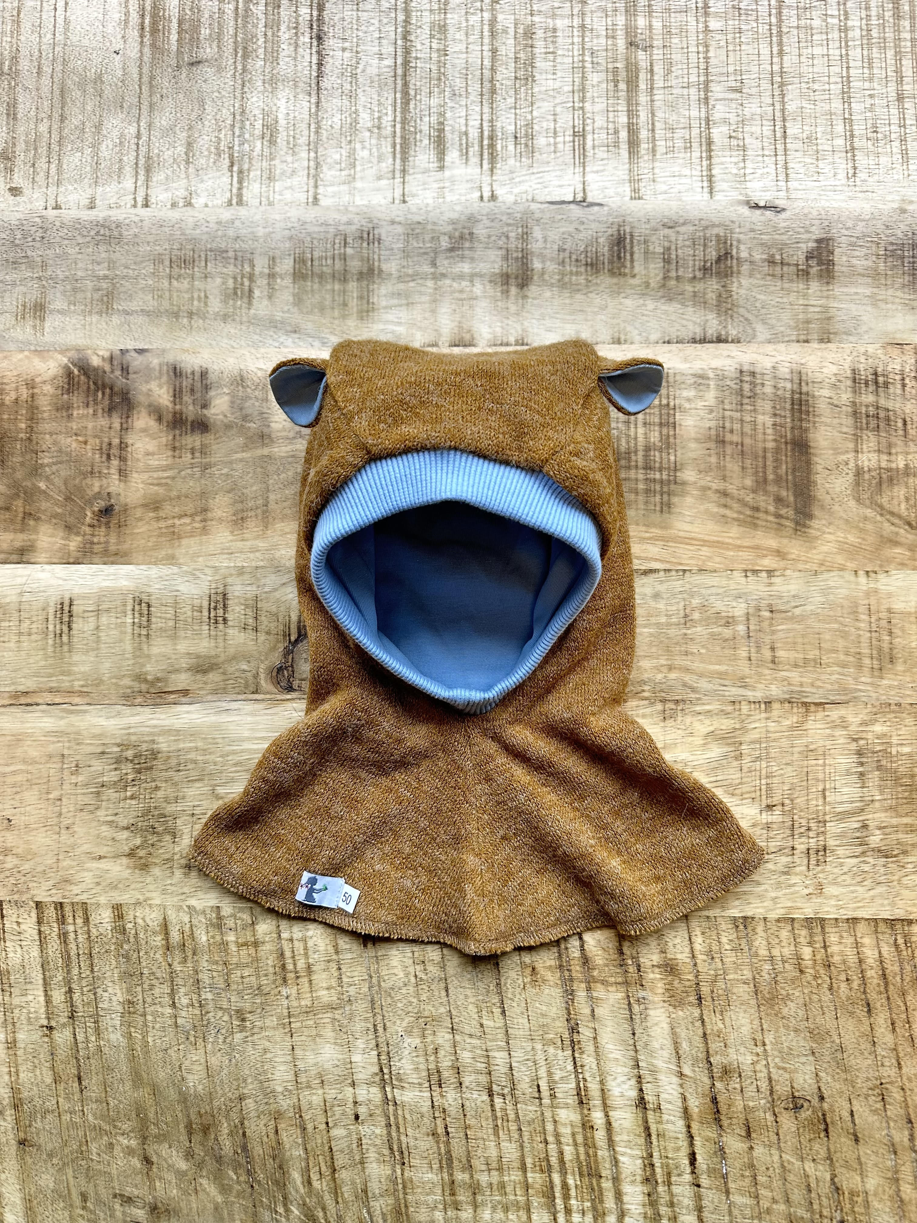 Ryžas šalmas su žydros spalvos medvilnės pamušalu.