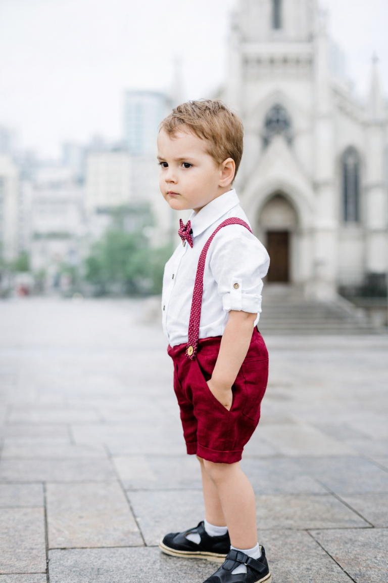 Lininis kostiumėlis su šortukais, marškinėliais, petnešomis ir varlyte.